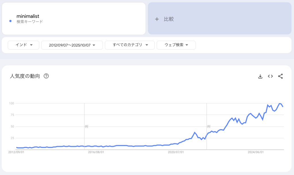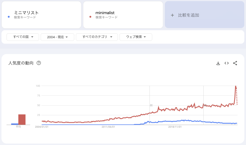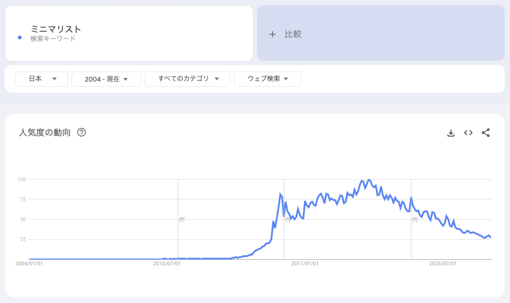 日本では2015年に「ミニマリスト」という言葉が一気に世間に認知され(新語・流行語大賞にノミネート)、そのピークは2020年1月だったようです。コロナの流行をきっかけに、緩やかなダウントレンドに移行しています。